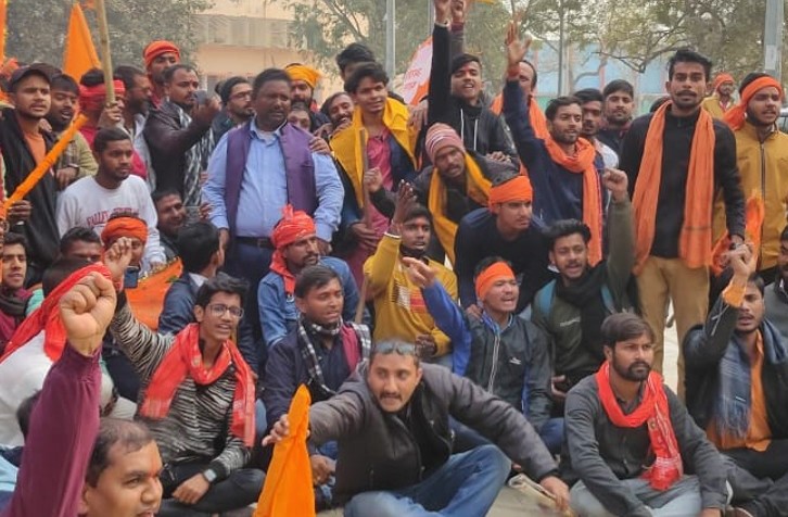 पटना: बिहार में इन दिनों सियासी गलियारे काफी गर्म है. जिसकी लौ अब विश्वविद्यालय में भी देखने को मिल रही है. पटना का अशोक राजपथ आज रन क्षेत्र में तब्दील हो गया और पटना विश्वविद्यालय गेट पर सैकड़ों की संख्या में छात्र और नौजवान हाथों में भगवा झंडा लेकर प्रदर्शन करने लगे. प्रदर्शन कर रहे लोगों ने बताया कि पटना विश्वविद्यालय में भगवा झंडा को जलाया गया था जिसके विरोध में वह प्रदर्शन कर रहे हैं.