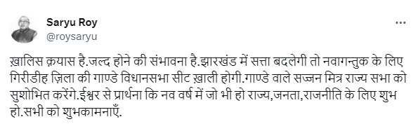 उधर, निर्दलीय विधायक सरयू राय ने ‘एक्स’ पर लिखा- खालिस कयास है। जल्द होने की संभावना है। झारखंड में सत्ता बदलेगी तो नवागन्तुक के लिए गिरिडीह जिले की गांडेय विधानसभा सीट खाली होगी। गांडेय वाले सज्जन मित्र राज्यसभा को सुशोभित करेंगे। ईश्वर से प्रार्थना कि नववर्ष में जो भी हो राज्य, जनता, राजनीति के लिए शुभ हो, सभी को शुभकामनाएं।