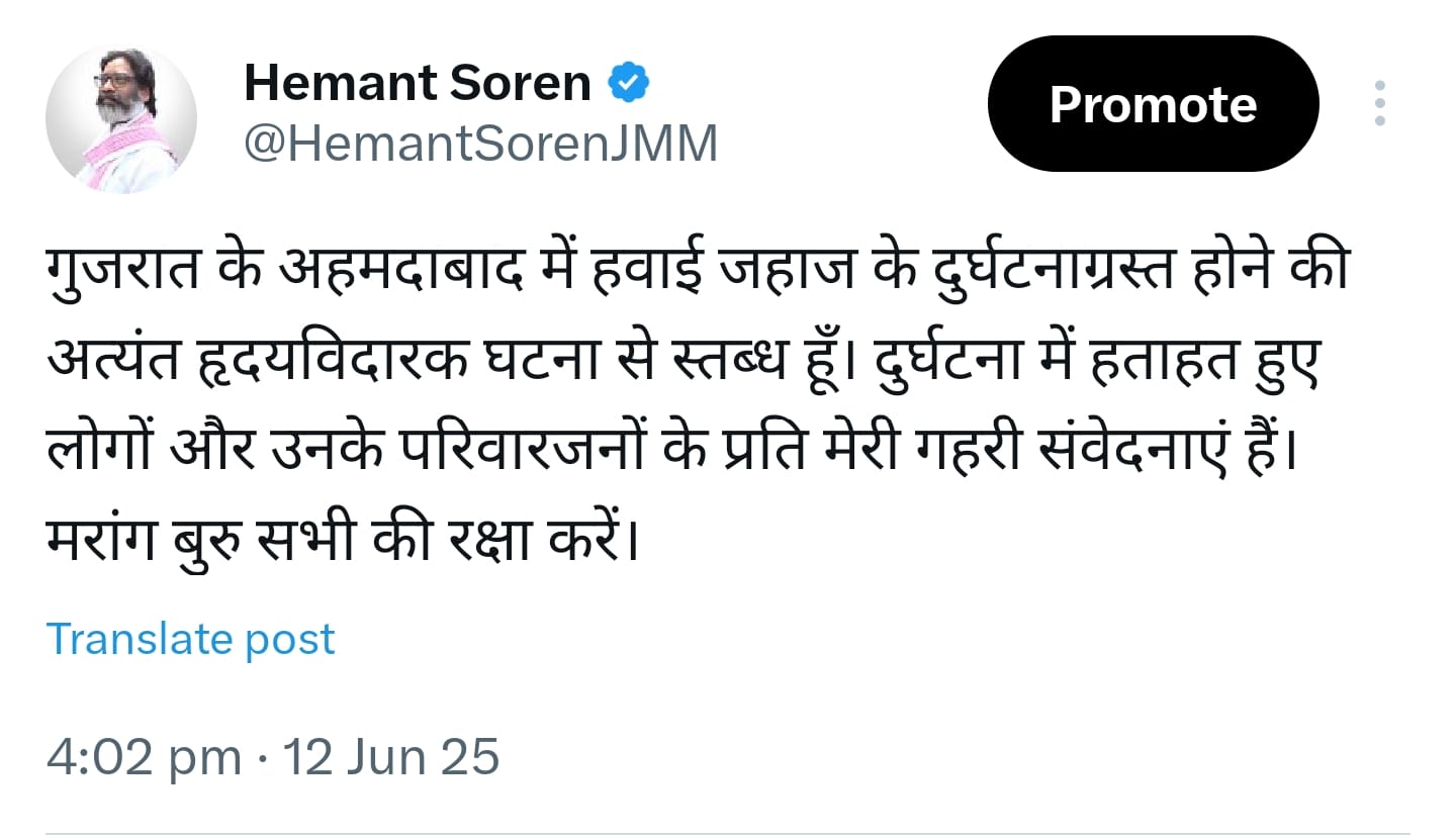 Share WhatsApp Facebook Twitter Copy Link Pinterest Email गुजरात में हुए एयर इंडिया के प्लेन क्रैश पर सीएम हेमंत ने जताया शोक।