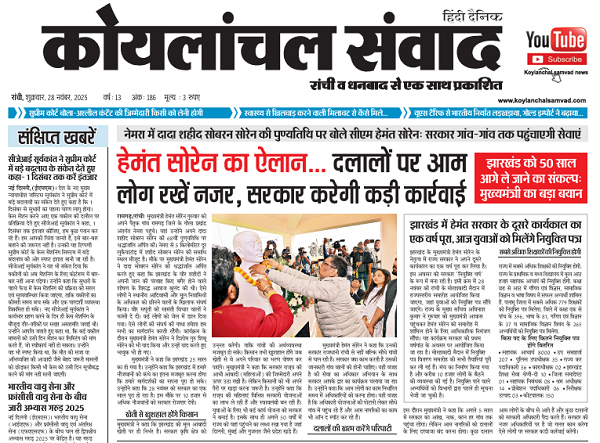 Home»E-Papper»E-paper Ranchi»Koylanchal Samvad e-paper | 28th Nov | Ranchi