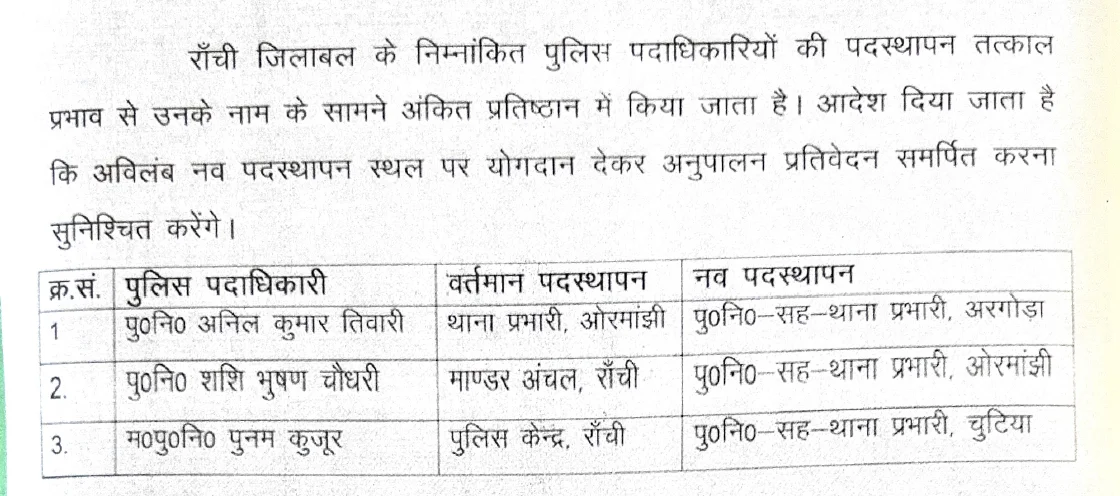 इसके अलावा, मांडर अंचल में सेवा दे रहे शशिभूषण चौधरी को ओरमांझी थाना प्रभारी की जिम्मेदारी सौंपी गई है। वहीं, पुलिस केंद्र में कार्यरत पूनम कुजूर को चुटिया थाना का नया प्रभारी नियुक्त किया गया है।
