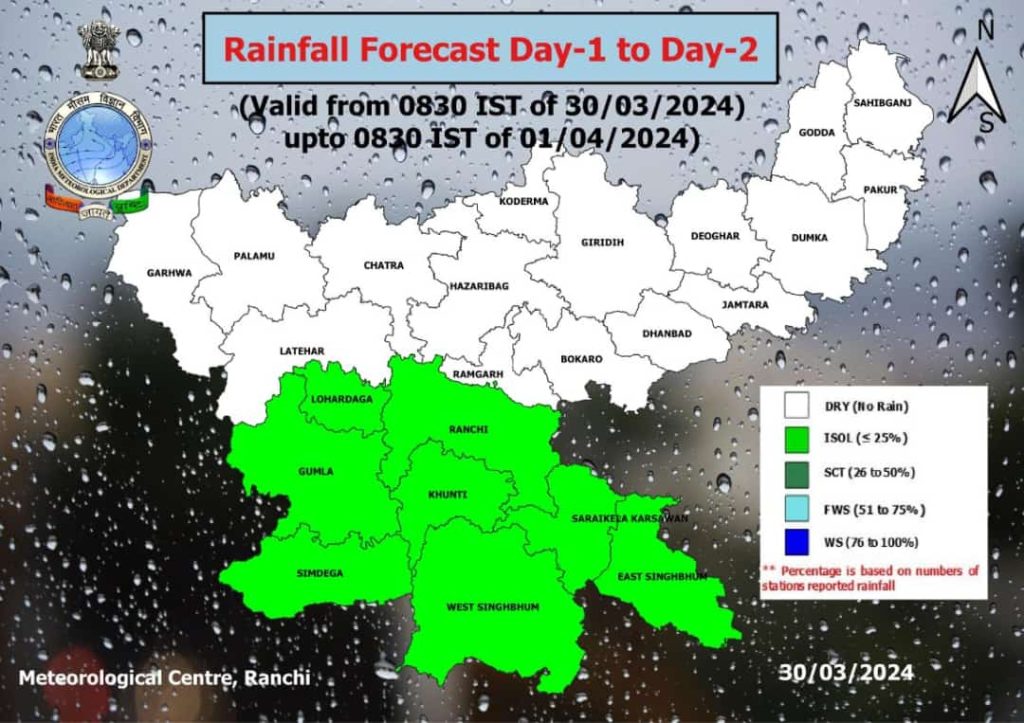 30 मार्च को राज्य के पश्चिमी, दक्षिणी और निकटवर्ती मध्य भाग में कुछ स्थानों पर बारिश की संभावना है. इसका असर गढ़वा, पलामू, लातेहार, चतरा, कोडरमा, हज़ारीबाग़, बोकारो, रामगढ़, लोहरदगा जिलों पर पड़ने की संभावना है. रांची, गुमला, खूंटी, सिमडेगा, पूर्वी सिंहभूम, पश्चिमी सिंहभूम, सरायकेला-खरसावां।