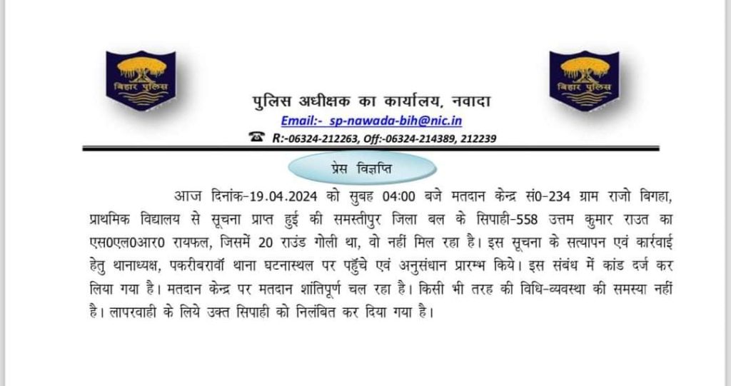 पकरीबरावां थानाक्षेत्र के ग्राम राजो बीघा गांव में स्तिथ प्राथमिक विद्यालय में बने मतदान केंद्र नंबर 234 पर तैनात एक जवान का SLR राइफल गायब हो गया है. जिसमे 20 राउंड गोली भी है, इस वारदात के बाद पुलिस महकमे में हड़कंप मच गया है पुलिस टीम रायफल की खोज बिन में जुटी है