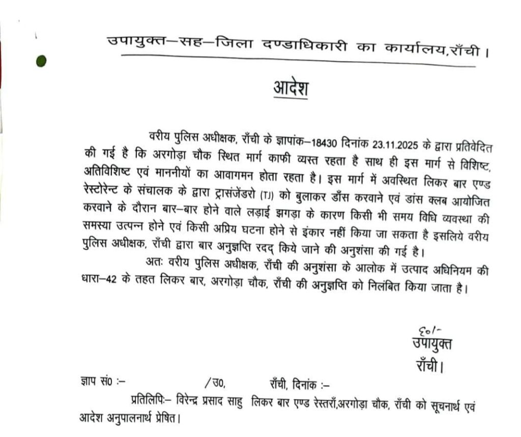 रांची: अरगोड़ा चौक स्थित एक लिकर बार पर कार्रवाई करते हुए प्रशासन ने उसकी बार लाइसेंस को निलंबित कर दिया है। यह कार्रवाई वरीय पुलिस अधीक्षक (SSP) रांची के ज्ञापांक संख्या 18430 (दिनांक 23.11.2025) की अनुशंसा के बाद की गई है।