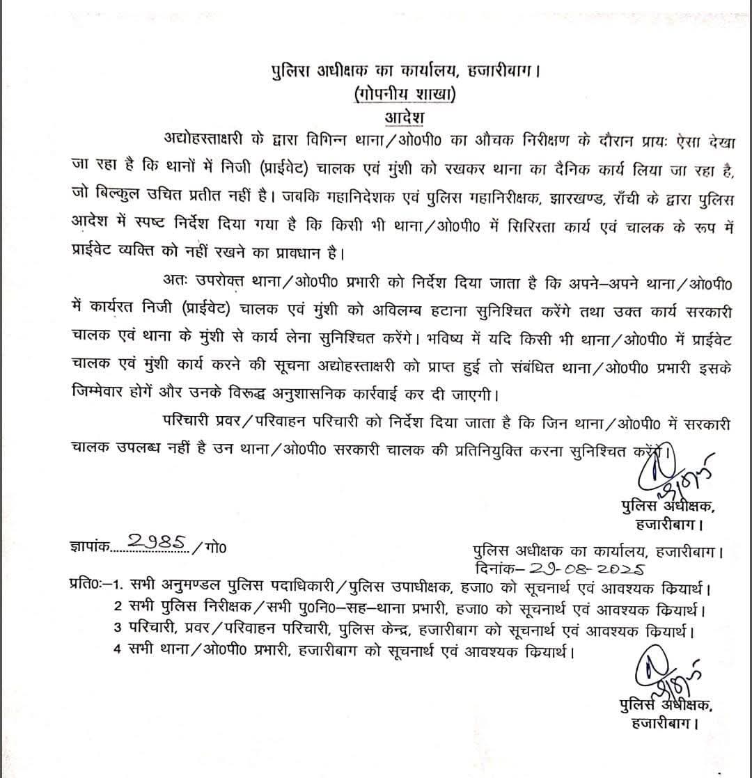 झारखंड के थानों में प्राइवेट ड्राइवर और मुंशी पर लगेगा ब्रेक, डीजीपी के आदेश के बाद एसपी ने जारी किया निर्देश