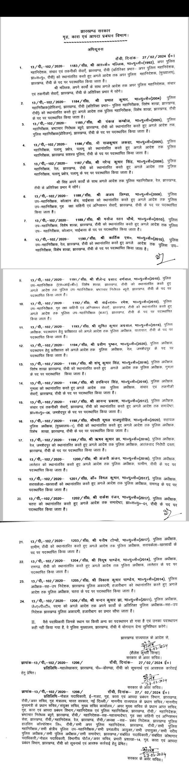 झारखंड के 24 IPS अधिकारियों का ट्रांसफर, देखिये पूरी लिस्ट