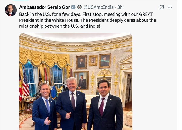 भारत में US के राजदूत सर्जियो गोर ने मंगलवार को व्हाइट हाउस में ट्रंप से मुलाकात करने के बाद X पर एक पोस्ट साझा किया। पोस्ट में उन्होंने कहा कि US राष्ट्रपति डोनल्ड ट्रंप US-भारत संबंधों को बहुत ज्यादा अहमियत देते हैं। गोर ने आगे कहा, “कुछ दिनों के लिए US वापस आया हूं। सबसे पहले, व्हाइट हाउस में हमारे राष्ट्रपति से मुलाकात हुई। राष्ट्रपति US और भारत के बीच संबंधों को बहुत ज्यादा अहमियत देते हैं।”